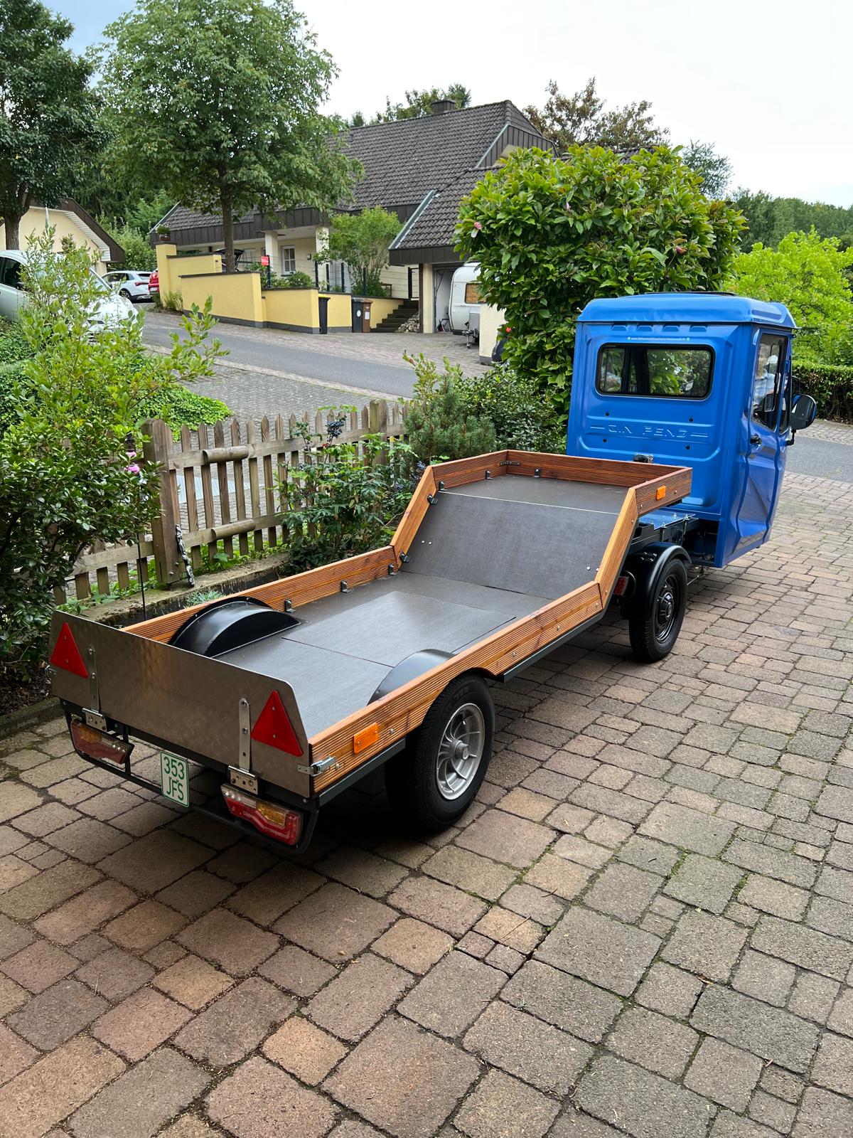 - Gesamtlänge Fahrzeug mit Auflieger 5,00 m – Länge Ladefläche 3 m, Breite 0,99 m, Höhe Vorderkante 0,77 m, Höhe hintere Ladekante 0,45 m