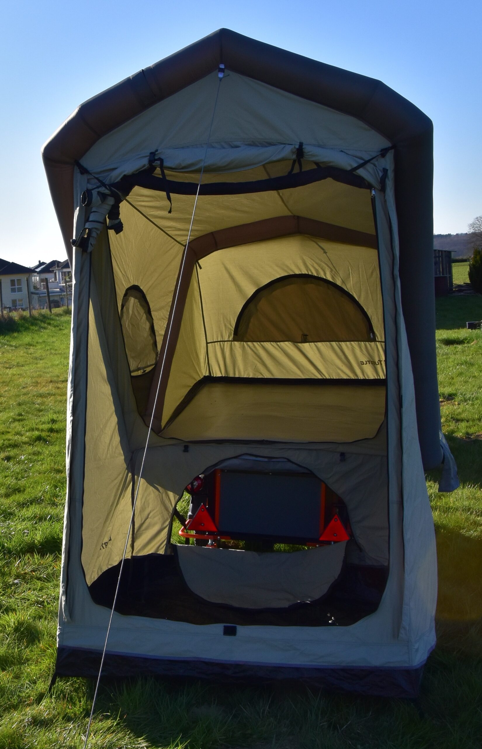 - viel Stauraum unterhalb vom Zelt – entweder mit integrierter, geschlossener, abschließbarer Box mit einer Heckklappe und einer Klappe im vorderen Bereich oben